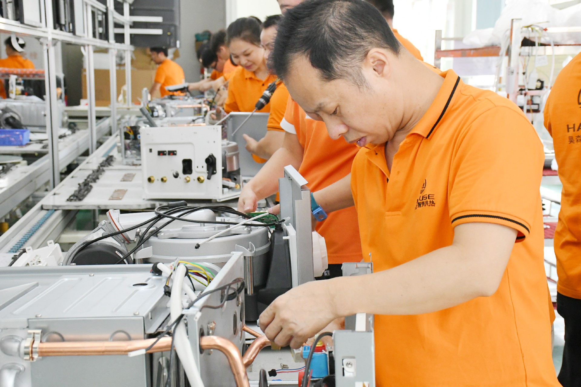 此次“匠心杯”手艺大赛,车间制订了详细的竞赛计划,制订了角逐规则和评分标准。本次参赛选手分为6个小组,共有3位监视员和一位记分员。每组成员需要凭证角逐规则配合完成一台全预混冷凝壁挂炉和一台大气式壁挂炉的装配和测试。