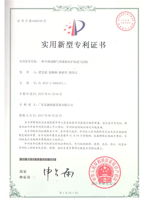 适用新型专利证书